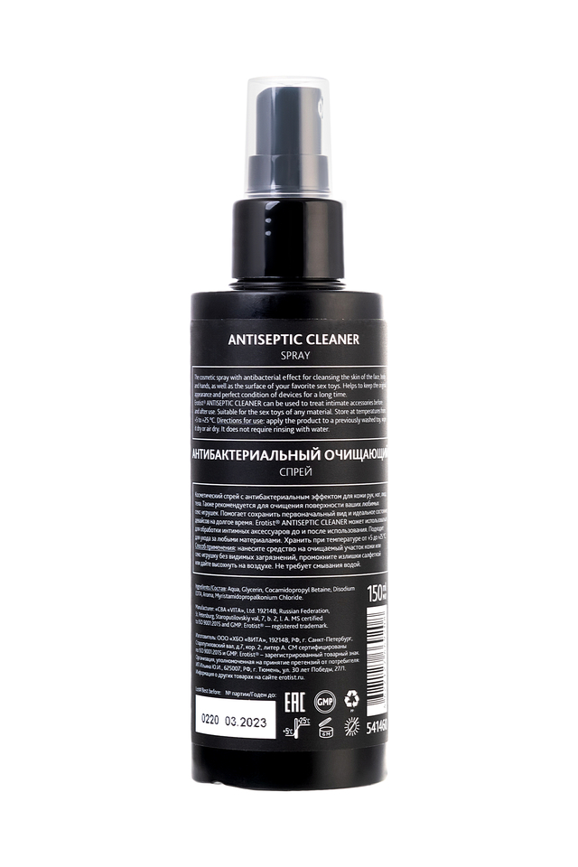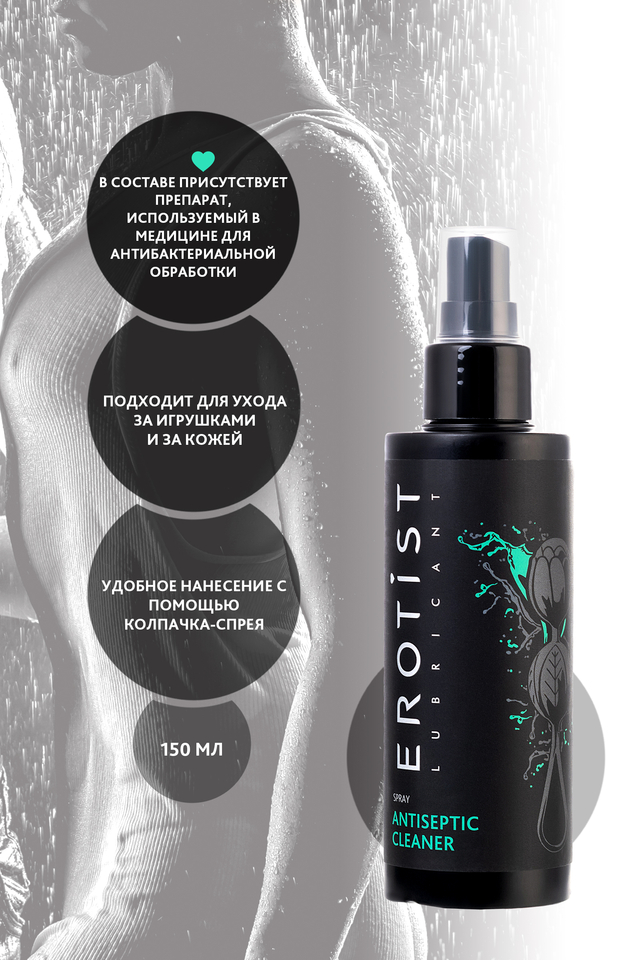 Для наилучшего эффекта помойте игрушку водой, а затем нанесите Anticeptic Cleaner от Erotist®. Промокните излишки салфеткой или дайте высохнуть на воздухе. Для антибактериальной защиты кожи нанесите на очищаемый участок и равномерно распределите.