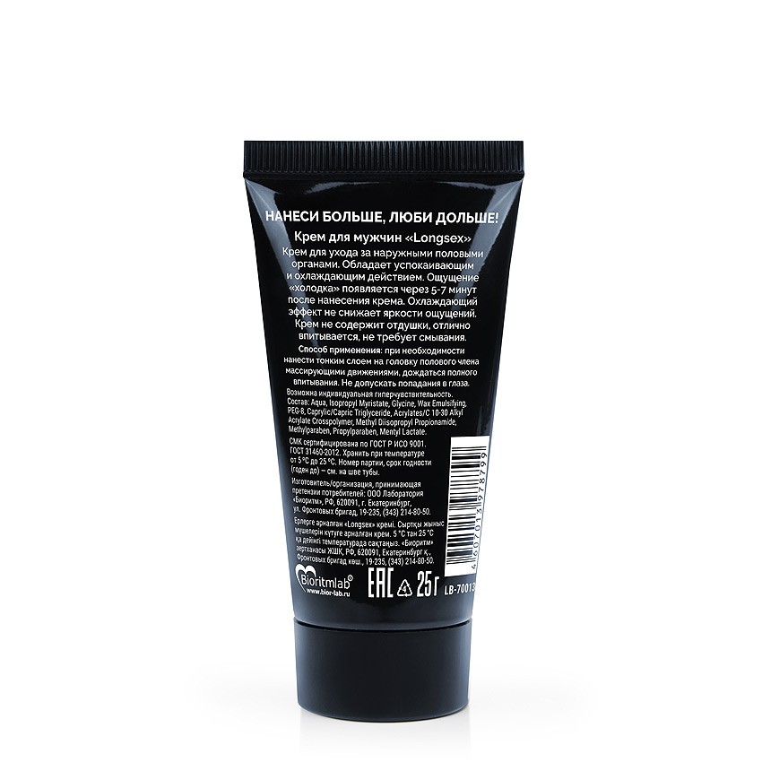 LongSex – крем пролонгатор для мужчин, стоп-крем быстрого действия. Крем быстро впитывается и начинает действовать уже через 5 минут после нанесения. Позволяет открыть новые грани незабываемого долгого секса. Ухаживает за кожей полового члена, оказывает смягчающие и успокаивающие действие. Крем «LongSex» идеально подходит для мужчин с повышенной чувствительностью, позволяя контролировать время полового акта. Не влияет на яркость ощущений, эрекцию и потенцию. Без запаха. После использования не требует специального удаления. Совместим с презервативами, изделиями из латекса и синтетических материалов.