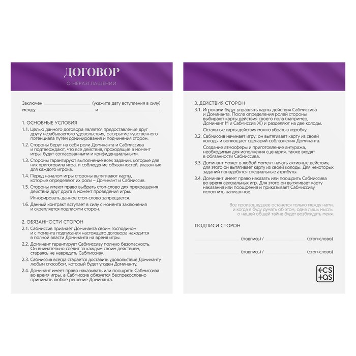 Подпишите договор о неразглашении и выберите желаемую роль. Один из вас будет доминирующим (доминантом), а другой — подчиняющимся (сабмиссивом). Доминирующий вступит в права владения телом и желаниями партнёра, а подчиняющемуся предстоит покорно следовать указаниям и… сдерживать крики удовольствия.