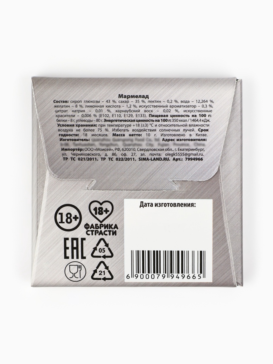 Состав: сироп глюкозы – 43 %, сахар – 35 %, пектин – 0,2 %, вода – 12,264 %, желатин – 8 %, лимонная кислота – 1,2 %, искусственный ароматизатор – 0,3 %, цитрат натрия – 0,01 %, карнаубский воск – 0,02 %, искусственные красители – 0,006 % (Е102, Е110, Е129, Е133).