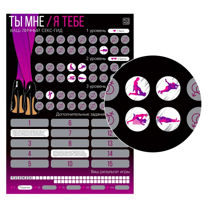 Секс-позы делятся на 3 уровня сложности. За позы 1-го уровня вы получите по 1 баллу, за позы 2-го уровня — 2 балла, за позы 3-го уровня — 3 балла. Вместе или по очереди выбирайте любой круг и стирайте скретч-слой, чтобы узнать позу. Если под скретч-слоем вместе с позой оказалась цветная цифра, то нужно стереть поле с заданием под соответствующей цифрой. Это может быть задание для него, для неё или для двоих. Их необязательно выполнять, но каждое выполненное задание принесёт дополнительные баллы и подарит новый опыт в ваших сексуальных отношениях.