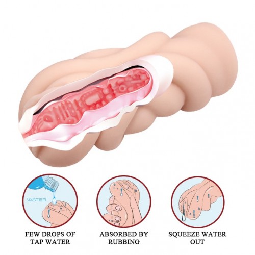 Мастурбатор с вагинальным отверстием изготовлен из особенного материала. Особенность заключается в том, что при добавлении нескольких капель воды в тоннель мастурбатора, материал принимает консистенцию скользящей, увлажняющей смазки. Имеет натуральный телесный цвет и очень правдоподобные внутренние складки, которые приносят ощущение полноценного сексуального контакта за счет плотного облегания ствола пениса. Его рельефная внешняя поверхность обеспечивает очень высокую степень эргономичности – во время мастурбации она не выскользнет из рук и не испортит ощущений удовольствия.