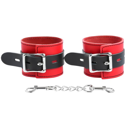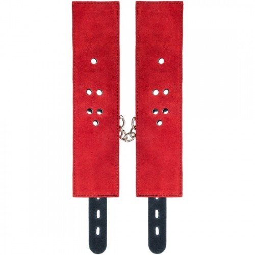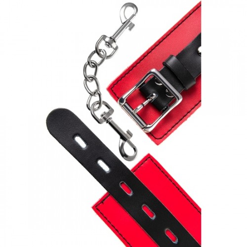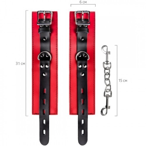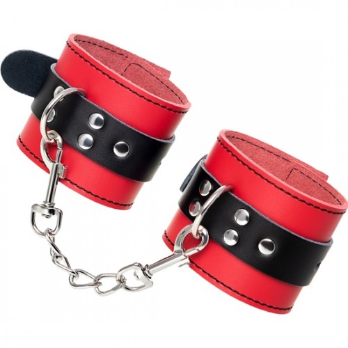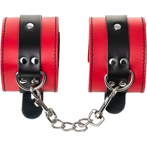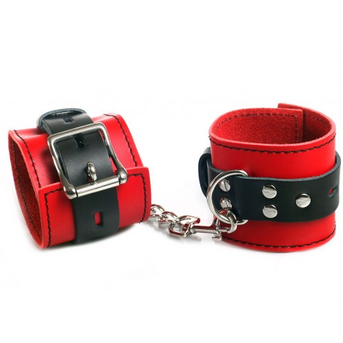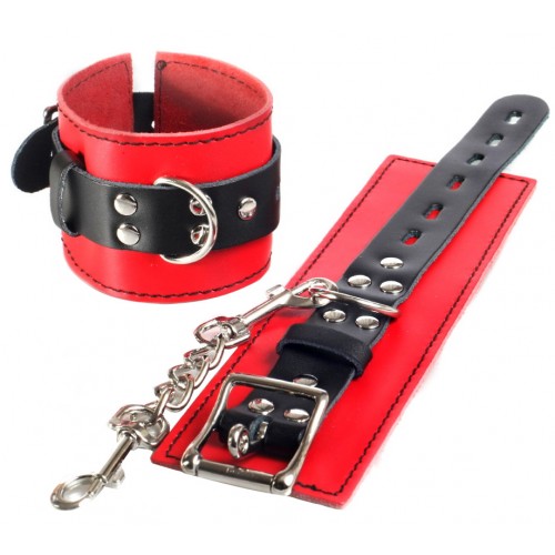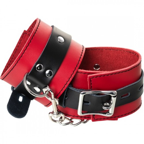 Наручники изготовлены из высококачественной натуральной кожи. Выполнены в красно-чёрном цвете, соединены между собой цепочкой на карабинах. Металлическая пряжка крепко удерживает в подчинении, цепь на карабинах фиксирует наручники вместе, ремни позволяю выбрать нужный размер. Мягкая натуральная кожа обеспечит комфортное прибывание в образе, помогая полностью погрузиться в БДСМ игру.