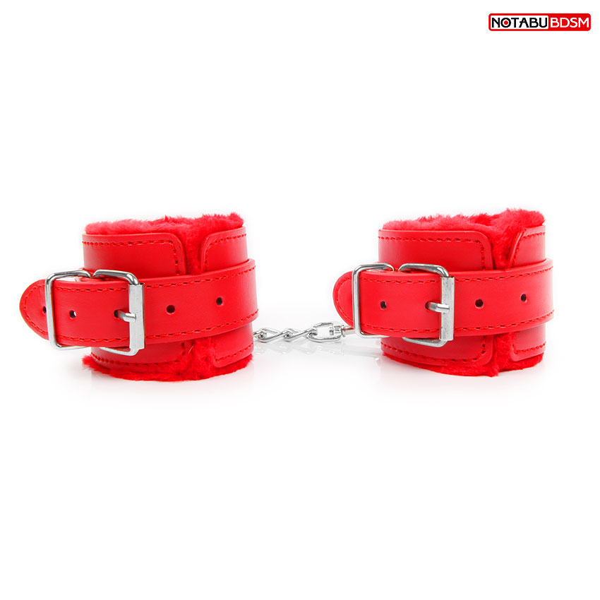 Наручники, изготовленные из искусственной кожи красного цвета, придадут Вашему образу сексуальности. Внутренняя сторона изделий отделана мехом, который препятствует натиранию кожи. Удобная застёжка позволяет надеть наручники на любой размер руки. При изготовлении использована фурнитура с никелевым покрытием. Соединяются между собой коротким ремешком с двумя карабинами на концах. Не нарушают кровообращение, надёжно фиксируются на запястьях.