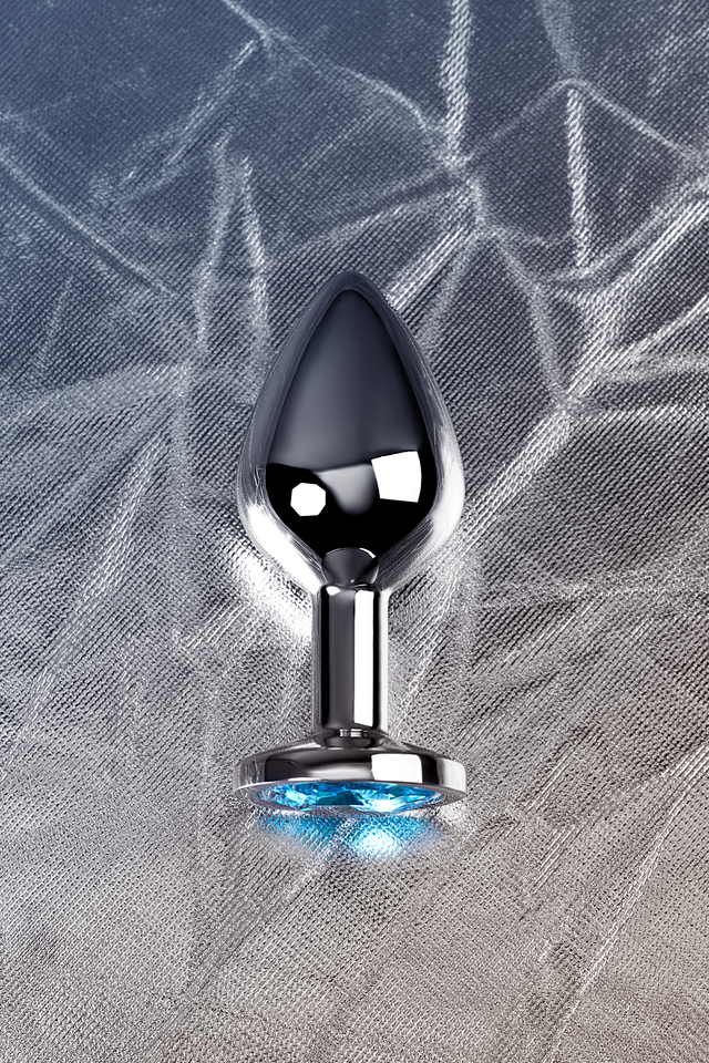Анальная втулка со стразом, серебристая, с голубым кристаллом, 8 см, Ø 3,4 см, 85 г